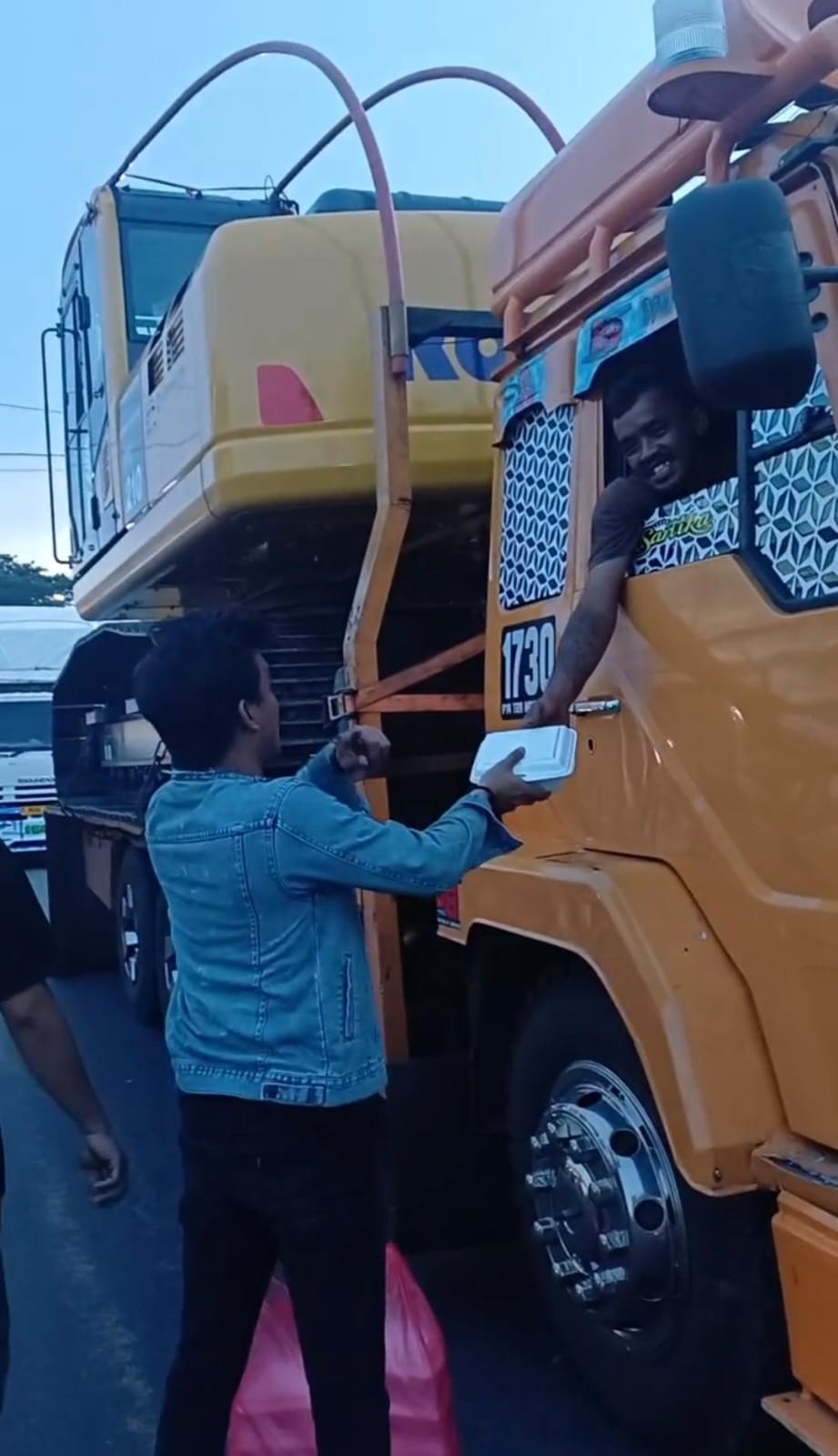 Mereka berinisiatif membagikan nasi kotak kepada para sopir yang tertahan berjam-jam akibat aksi tersebut.