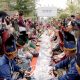 Usai salat berjamaah, massa makan bersama dengan menyantap roti, gorengan, kopi, dan makanan ringan yang dibagikan oleh warga sekitar.