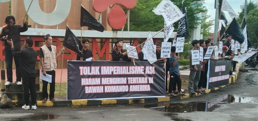 Spanduk berwarna hitam tersebut dengan tegas menyuarakan tuntutan utama mereka yang bertuliskan “Tolak Imperialisme AS! Haram Mengirim Tentara di Bawah Komando Amerika”.