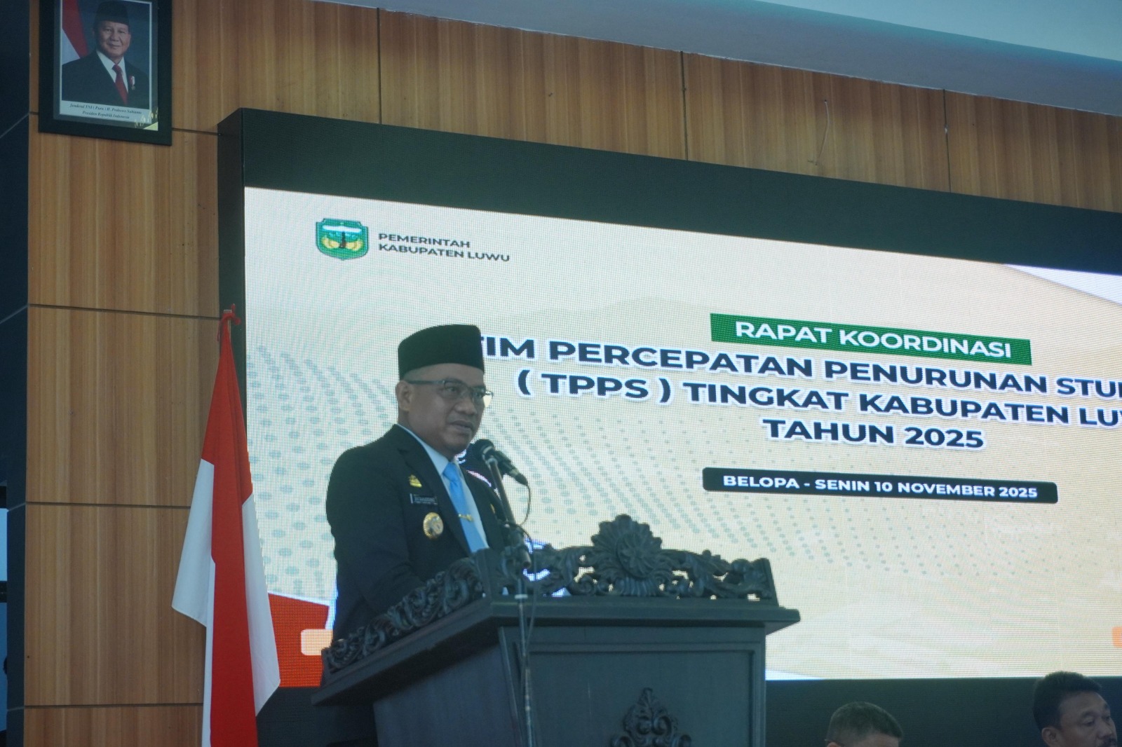 LUWU – Bupati Luwu Patahudding membuka secara resmi Rapat Koordinasi Tim Percepatan Penurunan Stunting (TPPS) Tingkat Kabupaten Luwu Tahun 2025 yang berlangsung di Ruang Pola Kantor Bupati Luwu, Belopa, Senin (10/11/2025).
