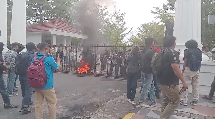 Asap hitam membumbung tinggi dari ban bekas yang dibakar massa di depan gerbang utama.