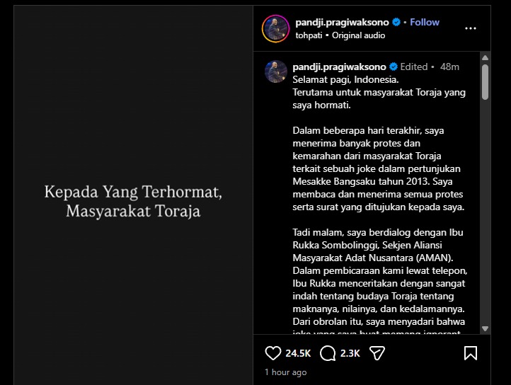 Dalam unggahan di akun Instagram resminya pada Selasa (4/11/2025), Pandji mengaku menyesal karena materi yang ia bawakan saat itu menyinggung tradisi Rambu Solo’, upacara pemakaman adat yang memiliki nilai spiritual dan sosial yang sangat tinggi bagi masyarakat Toraja.