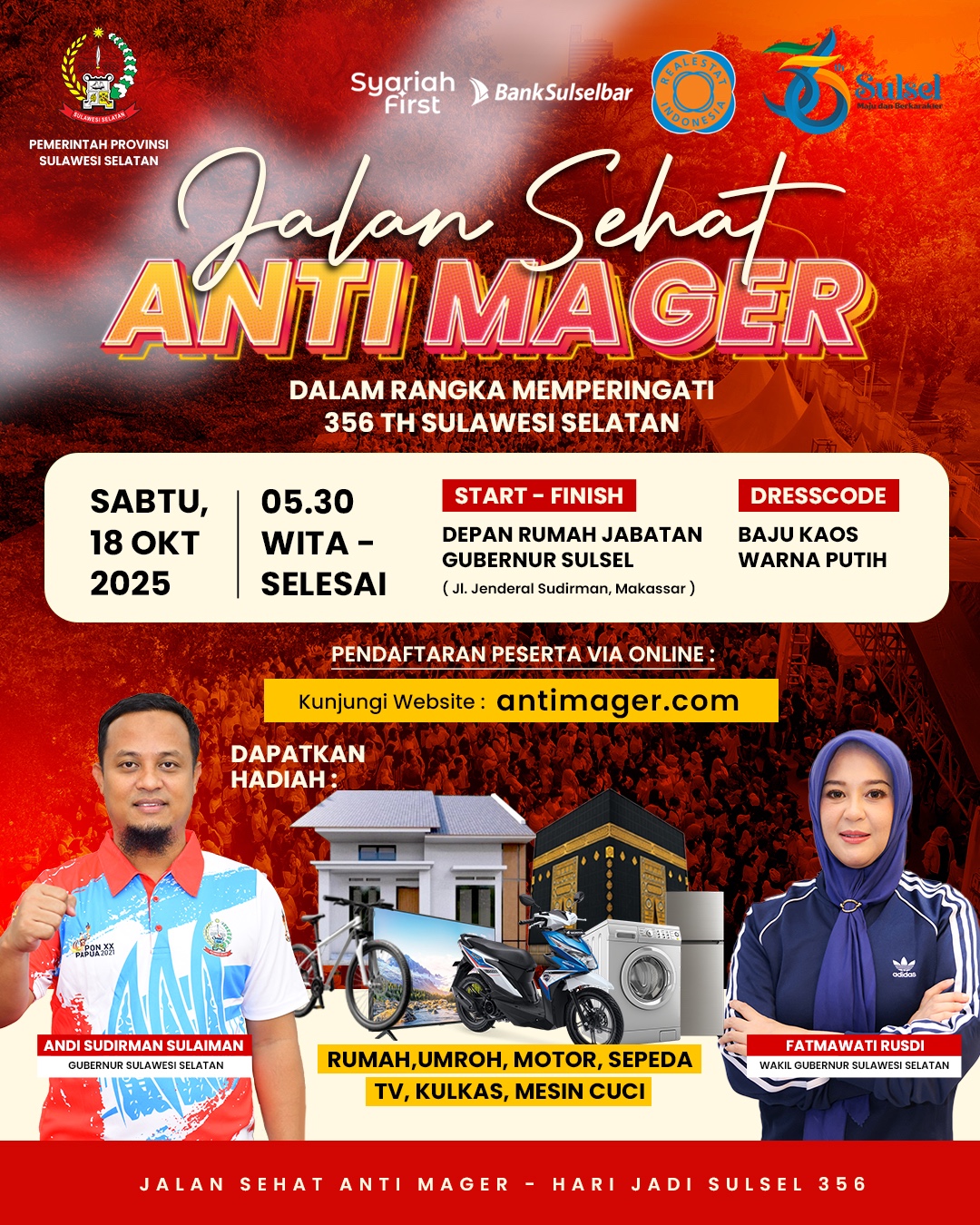 SULSEL – Pemerintah Provinsi Sulawesi Selatan akan menggelar kegiatan Jalan Sehat Anti Mager (Malas Gerak) sebagai bagian dari peringatan Hari Jadi Provinsi Sulawesi Selatan ke-356 tahun.