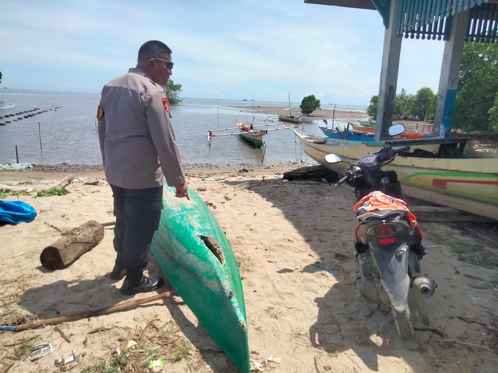 Nelayan setempat mengamankan satu unit perahu dayung kecil berbahan fiber berwarna hijau yang dicurigai kuat digunakan pelaku pengeboman ikan.