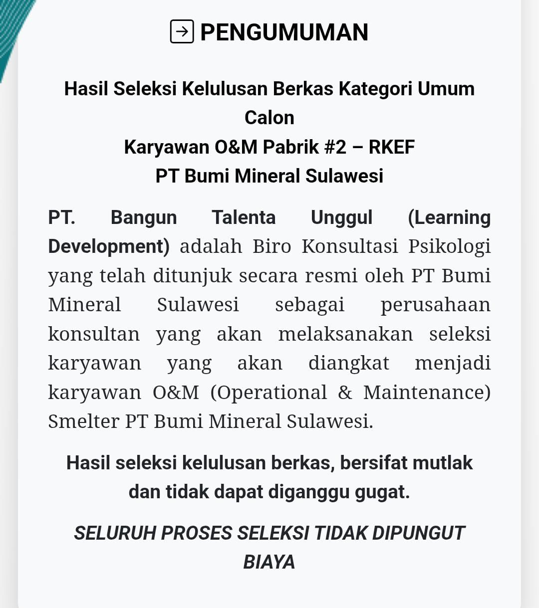 Pengumuman hasil seleksi tersebut dirilis melalui website PT Bumi Mineral Sulawesi, Rabu malam, (22/10/2025).