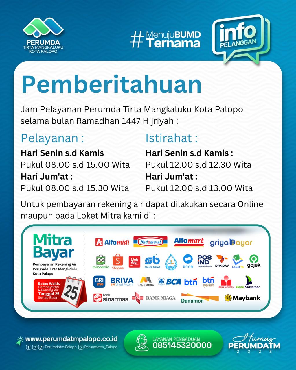 “Penyesuaian jam kerja ini kami lakukan untuk menghormati bulan suci Ramadan. Meski ada perubahan waktu, kami memastikan komitmen pelayanan kepada pelanggan tetap berjalan optimal dan prima,” ujar pihak Humas Perumda Tirta Mangkaluku dalam keterangannya.