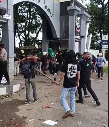 “Awalnya kawan kami orasi di pagar, pas orasi ditarik dan diinjak-injak. Akibat aksi represif itu, kawan kami mengalami luka lebam dan sesak napas. Hal inilah yang memicu gesekan hingga terjadi saling lempar,” ujar Adriansyah, seperti dikutip dari Metrotv.